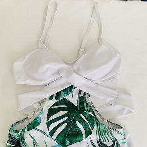 SHEIN Swimsuit Women S One Piece White Green Leaf Tropical Cut-Out Wrap NWOT