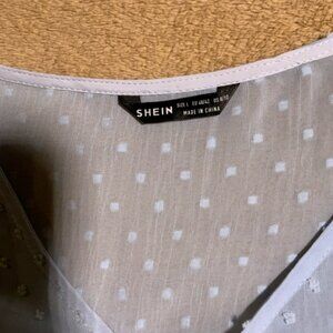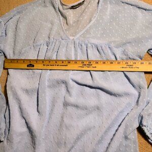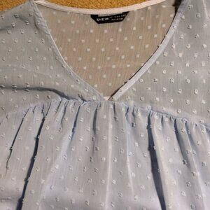 Elevate your wardrobe with this serene SHEIN Size Large Light Baby Blue 3/4 Sleeve V-neck Blouse, perfect for a chic and sophisticated look. Delight in the pastel hue of this blouse, featuring a soft baby blue color that's as calming as the sky. The blouse boasts a delicate dot pattern throughout, adding texture and a touch of playfulness to the design. The elegant V-neck further enhances the blouse's feminine charm, making it a versatile addition to any outfit. With 3/4 sleeves, it offers both comfort and modest coverage, ideal for transitioning between seasons. The fabric drapes gracefully over the body, providing a flattering silhouette for various body types. Its airy material ensures breathability and ease of movement. Pair it with slacks for a business casual look or with jeans for a relaxed weekend style.