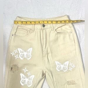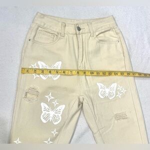Stylish boot cut jeans. Tan color with white butterfly and star design. Distressed details for a trendy look. Perfect for casual wear.
