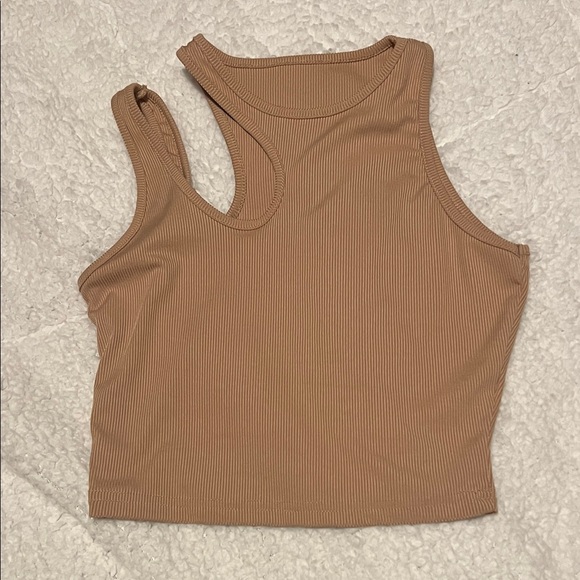 Chic tan ribbed tank top. Ideal for casual wear. Soft and comfortable fabric.