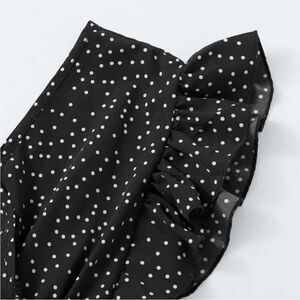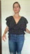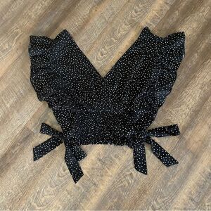 SHEIN Polkadot elastic stretch side tie crop top. Black with allover white dot print. V neck: front and back. Smocked waist in front and back with ample stretch. Adjustable bow ties on each side. Material: 65% cotton, 35% polyester. Plus size 3X. Please see photo section for approximate flat measurements + my model stats. Note this is very stretchy and is loose fitting on me.