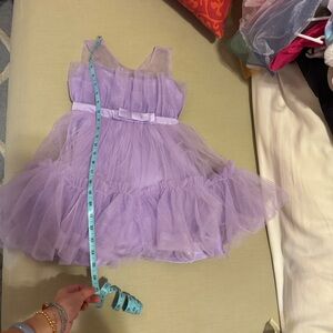 Excellent condition lavender purple dress with bow detail zipper closure mostly made of mesh has a comfortable light lavender lining. Size 120, which is around a 4 to 5-year-old. See measurements in photo for more detail no major flaws..