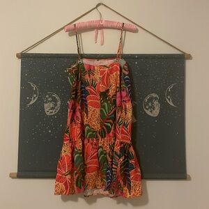 Bright and colorful floral dress with spaghetti straps. Features a mix of pink, green, and yellow hues. Perfect for a lively summer look.