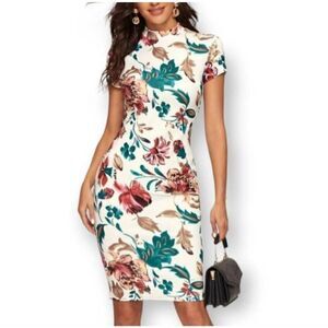 SHEIN WHITE, PINK, & GREEN FLORAL PRINT MOCK NECK BODYCON DRESS SZ.S EUC.