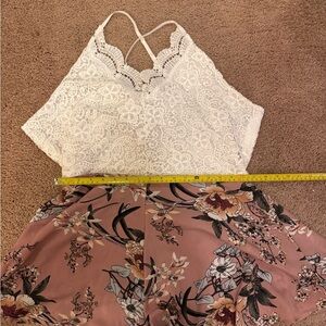 Elegant white lace top. Floral patterned shorts. Perfect for summer outings. Tie back adjustable straps