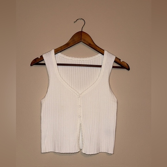 Stylish white ribbed tank with button-front detail. Ideal for layering or standalone wear.