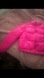 Bright pink puffer jacket. Features a high collar and front pockets. Ideal for cold weather.