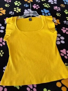 Vibrant yellow ribbed tank with delicate ruffle sleeves. Stretchy fabric for a comfortable fit. Sleek scoop neckline for a feminine look. Easy to style with casual or dressy outfits.