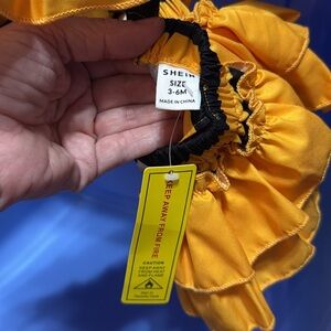 Charming romper with vibrant yellow and black ruffles. Perfect for playful days. New with tags. 2 available.