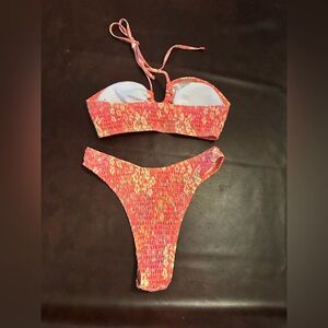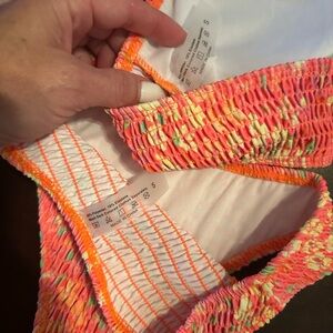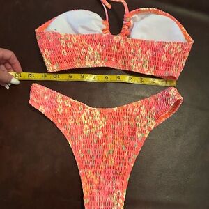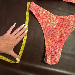 Super cute, new without tags Brazilian cut bikini. Top can tighten cleavage and toes around the neck. Orange and pink with yellow and green specks. Scrunchy look.