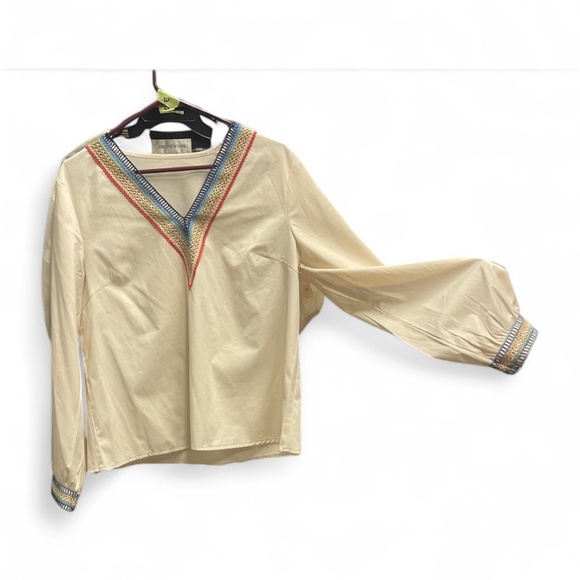 This is a SHEIN puff sleeve blouse in off-white with rainbow trim