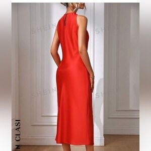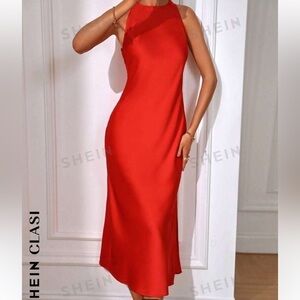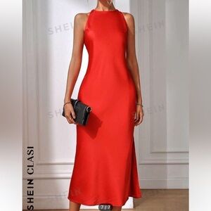 SHEIN Clasi Solid Split Thigh Dress For New Year Holiday Party Clothes Maxi Satin Women Outfit