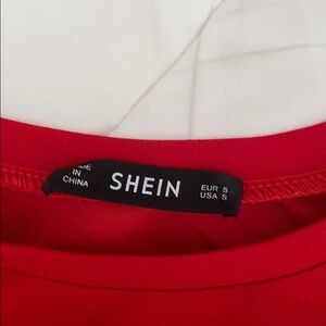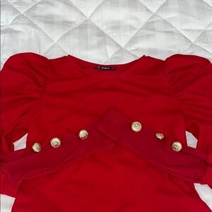 Beautiful red top, sleeves are slightly puff like and gathered. Sleeves have two different materials and tightens closer to the wrist. Gold button hardware. Under one side of the armpit has some slight loose stitching but no holes and no stains. Feel free to bundle with other items for better pricing.