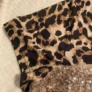 Shein short sleeve stretchy top part is leopard print, middle is rose gold sequins & bottom & back is black. NWOT 92% polyester 8% spandex. Womens size Medium
