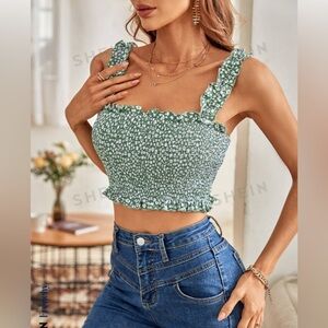 SHEIN women’s Frenchy Ditzy Floral Shirred Frill Trim Cami. Sz 8/10 Green