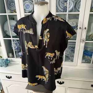 Chic black top with tiger and leopard pattern. Perfect for casual outings. Size Medium