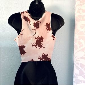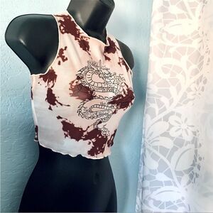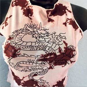 Cute pink tie dye mesh Chinese dragon crop tank top. Round high neckline. Lettuce edge trim. New without tags. Polyester/spandex fabric. SHEIN Size Small