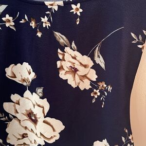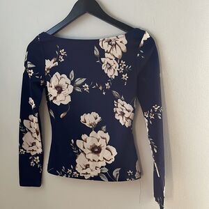 Cute top to wear with jeans or a skirt. Navy background with a tan floral pattern. Long sleeve, scoop neck.