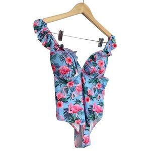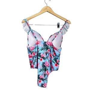 SHEIN Flamingo Swimsuit Size Large Tropical Print Ruffle Blue/Pink Padded