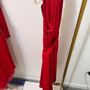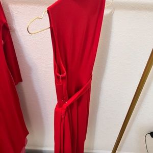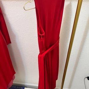 Red sleeveless dress with faux wrap bodice, navy trim Full skirt with belt tie. Midi length Size 10 - NEW