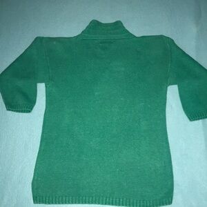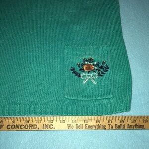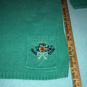 SHENANIGANS V neck knit green sweater embroidered flower bouquet on pocket.