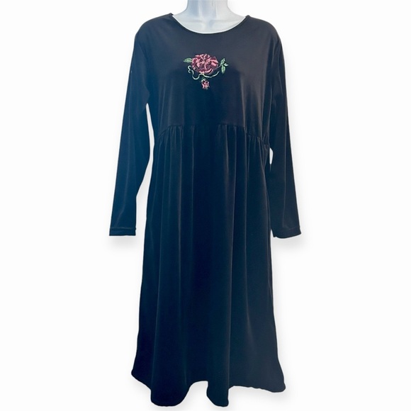 SHENANIGANS Vintage Black Velvet Embroidered Rose Long Sleeve Midi Babydoll M