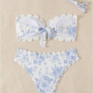 Chic bikini set with blue floral pattern. Features scalloped edges for a stylish look.