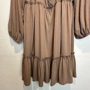 A solid maternity long sleeve mini dress with a crossover tie back detail, and ruffle accents.
