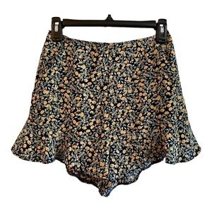 SHE+SKY, NWOT, WOMENS DRESSY SHORTS. NAVY BACKGROUND WITH SMALL YELLOW FLORAL PRINT. FLUTTERY RUFFLED HEM, HIDDEN BACK ZIPPER, FULLY LINED. SIZE S