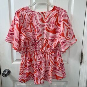 SHE+SKY Pink, Mauve and coral Empire waist Plunge Print Top w flutter sleeves Lg
