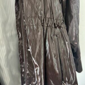 High-neck parka with concealed hood and metallic zipper. Long sleeves with adjustable straps and snap buttons. Front pockets with metallic zippers. Adjustable waist. Front zipper and snap button closure.