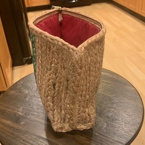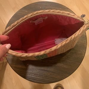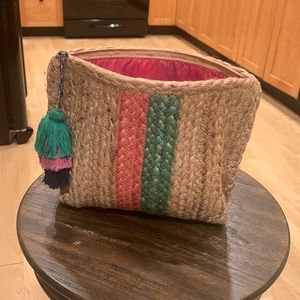 SHIRALEAH jute clutch. This bag is hardly used and from a smoke and clutter free home. It is an authentic tan jute bag with an attractive stripe design and zipper top with matching pom pom detail. The inside is pink nylon and deceivingly sized well. This would be perfect for throwing inside a beach bag to hold essentials or can be used as a small purse for a night out. Another statement piece!