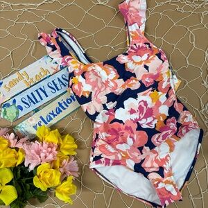 Freshen up your swimwear with this Full-Coverage Floral Print Ruffle-Sleeve One-Piece Swimsuit from Kona Sol™. Made of soft, stretchy fabric with full lining, this multicolored floral swimsuit is designed with a chic U-neckline front and a V-style back, along with a camouflaging ruching design across the waist for a flattering frame. Comfy shoulder straps with fluttery ruffle accents complete the design with a sweet look.