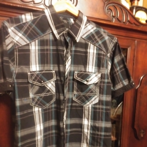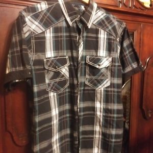 GRAY, WHITE AND BLUE BUTTON DOWN SHORT SLEEVE SHIRT.