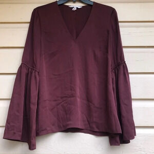 great condition size small burgundy color blouse. polyester material. 19in pit to pit, 24in sleeve,25 in long.
