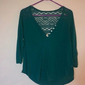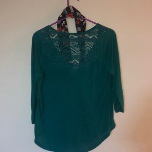 Quarter sleeve shirt with scarf to match. Simple top with a see through design on the back. This shirt would be perfect for literally any occasion!