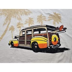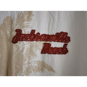 Unique shirt for Jacksonville Beach [Florida]. Adult size 2XL. Large shirt with a felt emblem sewed on that says "Jacksonville Beach" in a dark red. The shirt is a cream shirt with light yellow/cream colored palm trees in the background. On the bottom is an old fashion surfer woody station wagon giving the shirt a nostalgic look. Unique shirt that could be worn in many different ways - as a swim suit cover up, sleep wear or just a nice large shirt. Soft 100% cotton material. SIZE 2X
