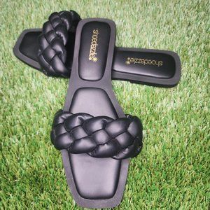 Size: 7.5 | SHOE DAZZLE | Luxury Brand Inspired Black Faux Leather Flats Sandals in Excellent Condition.