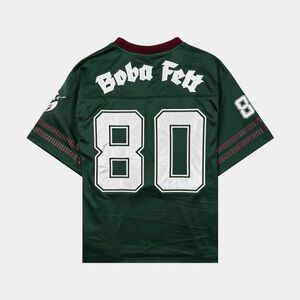 Vibrant green jersey with Bounty Hunter design. Features iconic helmet graphic. Ideal for young Star Wars fans.