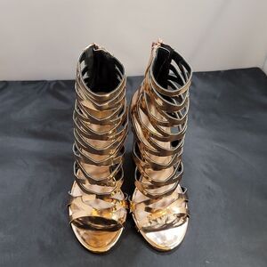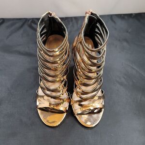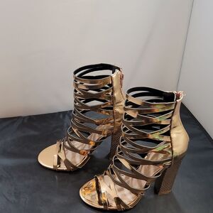 SHOE REPUBLIC LA WOMEN'S GLADIATOR CUT-OUT BLOCK HEEL PLATFORM SANDAL SIZE 71/2 COLOR ROSE GOLD ROUND OPEN TOE BACK ZIPPER CLOSURE MADE WITH ALL MAN-MADE MATERIALS LINING BALANCE MAN MADE UPPER TEXTILE LINING OUTSOLE MATERIAL CUSHIONED FOOTBED INSOLE HEEL HEIGHT MEASUREMENTS APPROX 4"INCHES THIS ITEMS IS PRE-OWNED EXCELLENT CONDITION WITH ONLY LIGHT SIGNS OF WEAR IF ANY CHECK THE PICTURES