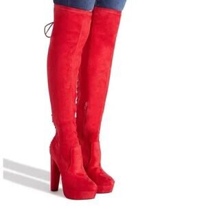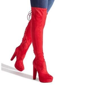 SHOEDAZZLE Elsy Lace Up Platform Boot in Red OTK 6.5 Over the Knee