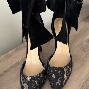 The ankle strap is adorned with oversized black velvet bows, adding a dramatic and sophisticated touch.