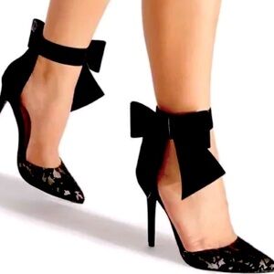 The ankle strap is adorned with oversized black velvet bows, adding a dramatic and sophisticated touch.