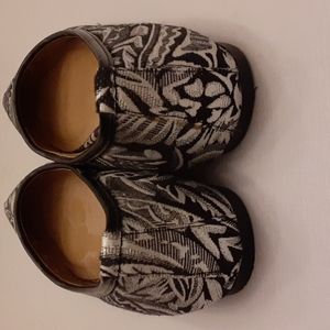Beautiful pair of glitzy flats. Size 7M. Pretty pattern in silver and black. A bit of a spakle in the silver. New condition. See pictures. Worn once. Comfortable. Dress up your feet for the holidays or any special occasion. Smoke free home.