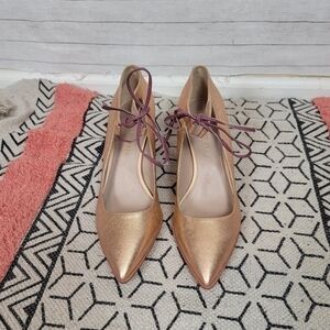 THESE ARE A GORGEOUS ROSE GOLD W A MAUVE PURPLE HEEL & CROSS ANKLE TIE DETAIL