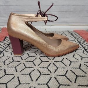 SHOES OF PREY ROSE GOLD W MAUVE PURPLE ANKLE TIE BLOCK HEELS, SZ 9