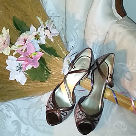 Anne Klein plaid trimmed in leather peekaboo with a bow three and a half inch heel