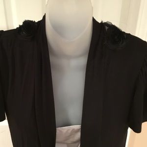 Short sleeve open front cardigan or cover up. Open lace on top of back. Rayon: 95% ▪️ Spandex: 5% Made in the USA🇺🇸