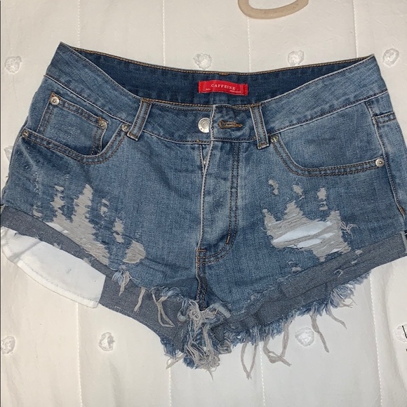 blue jean shorts with rips and is a little distressed at the bottom!!