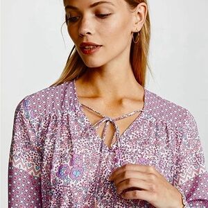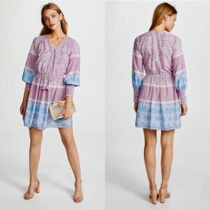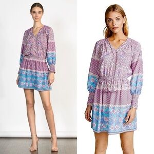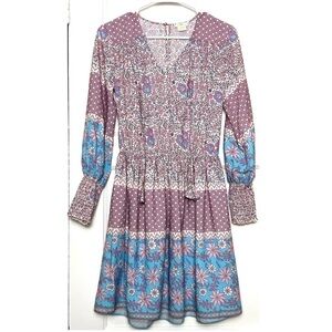 SHOSHANNA Floral Patchwork Puff Long Sleeve Smocked Cuff Tassel Tie Neck Dress 2